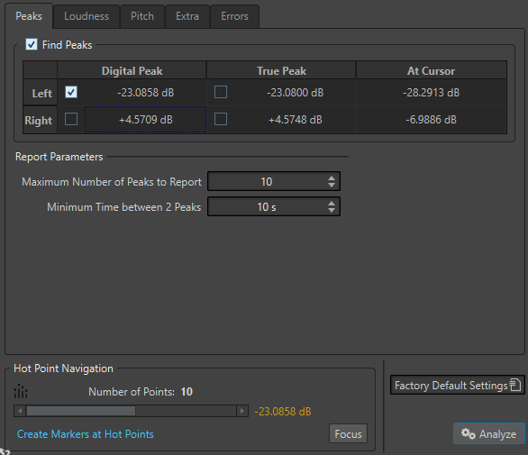 Muestra el pico más alto en la sección analizada. Al hacer clic en este valor, el número de picos detectados en la selección se muestra en la sección Número de puntos, en la esquina inferior izquierda del diálogo. Puede usar los puntos calientes para mover el cursor entre los picos.
